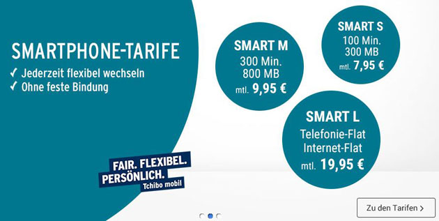 Das Tarifportfolio von Tchibo mobil umfasst derzeit zwei Smartphone-Tarife (Smart S und M), eine Allnet-Flat (Smart L) sowie einen Prepaid-Tarif sowie 3 Tablet-Datentarife - es ist also für jeden etwas dabei und auch preislich können die Tchibo-Tarife mit der Konkurrenz mithalten (>Mobilfunkrechner).