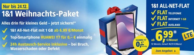 1&1 Weihnachtspaket: Huawei Y7 und Allnet-Flat LTE für 6,99 Euro