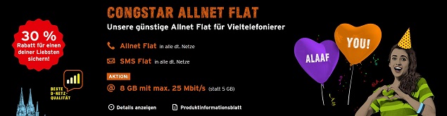 congstar Aktion "Alaaf You": Allnet Flat mit 8 GB ohne Aufpreis