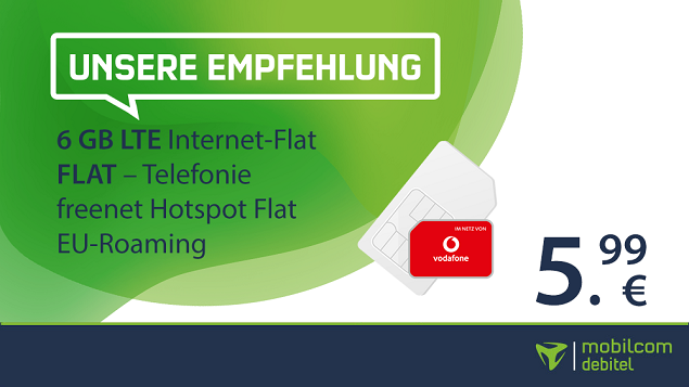 Ab sofort gibt es bei mobilcom-debitel eine 6 GB Vodafone Allnet Flat für nur 5,99 Euro pro Monat. Der Anschlusspreis wird ganz erlassen, allerdings muss man hierzu eine Werbeeinwilligung erteilen.