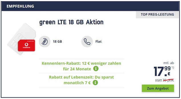 mobilcom-debitel senkt die Preise für die Allnet-Flats im LTE-Netz von Vodafone. So kostet der Tarif "Vodafone green LTE 18 GB" nur noch 17,99 Euro pro Monat statt bisher 19,99 Euro. Alle Infos zu dieser Aktion hier.