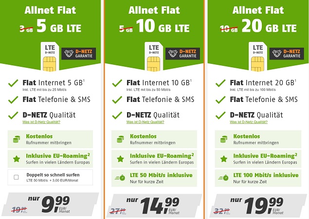 Ab sofort findet bei den Allnet Flats (10 GB & 20 GB) mit und ohne Netflix eine Aufwertung der Geschwindigkeit statt. Die LTE Allnet Flat 10 GB hat jetzt eine Bandbreite von 50 Mbit/s und die LTE Allnet Flat 20 GB sogar eine Bandbreite von 100 Mbit/st. Alle Infos zu den neuen klarmobil-Tarifen gibt es hier.
