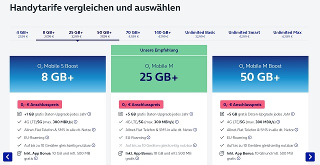 - o2 Mobile S statt 3 GB mit 4 GB + 1 GB je Laufzeitjahr (Grow-Bestandteil) = 22,99 €