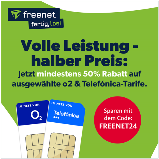 Ab sofort gibt es bei freenet eine neue Gutschein-Aktion. Mit dem Code FREENET24 wird der monatliche Preis bei ausgewählten O2- & Telefónica-Tarifen um mindestens 50% vom regulären Preis reduziert! Die Aktion geht bis zum 04.03.2024 und gilt für ausgewählte Tarife ohne Handy auf freenet-mobilfunk.de.Ab sofort gibt es bei freenet eine neue Gutschein-Aktion. Mit dem Code FREENET24 wird der monatliche Preis bei ausgewählten O2- & Telefónica-Tarifen um mindestens 50% vom regulären Preis reduziert! Die Aktion geht bis zum 04.03.2024 und gilt für ausgewählte Tarife ohne Handy auf freenet-mobilfunk.de.