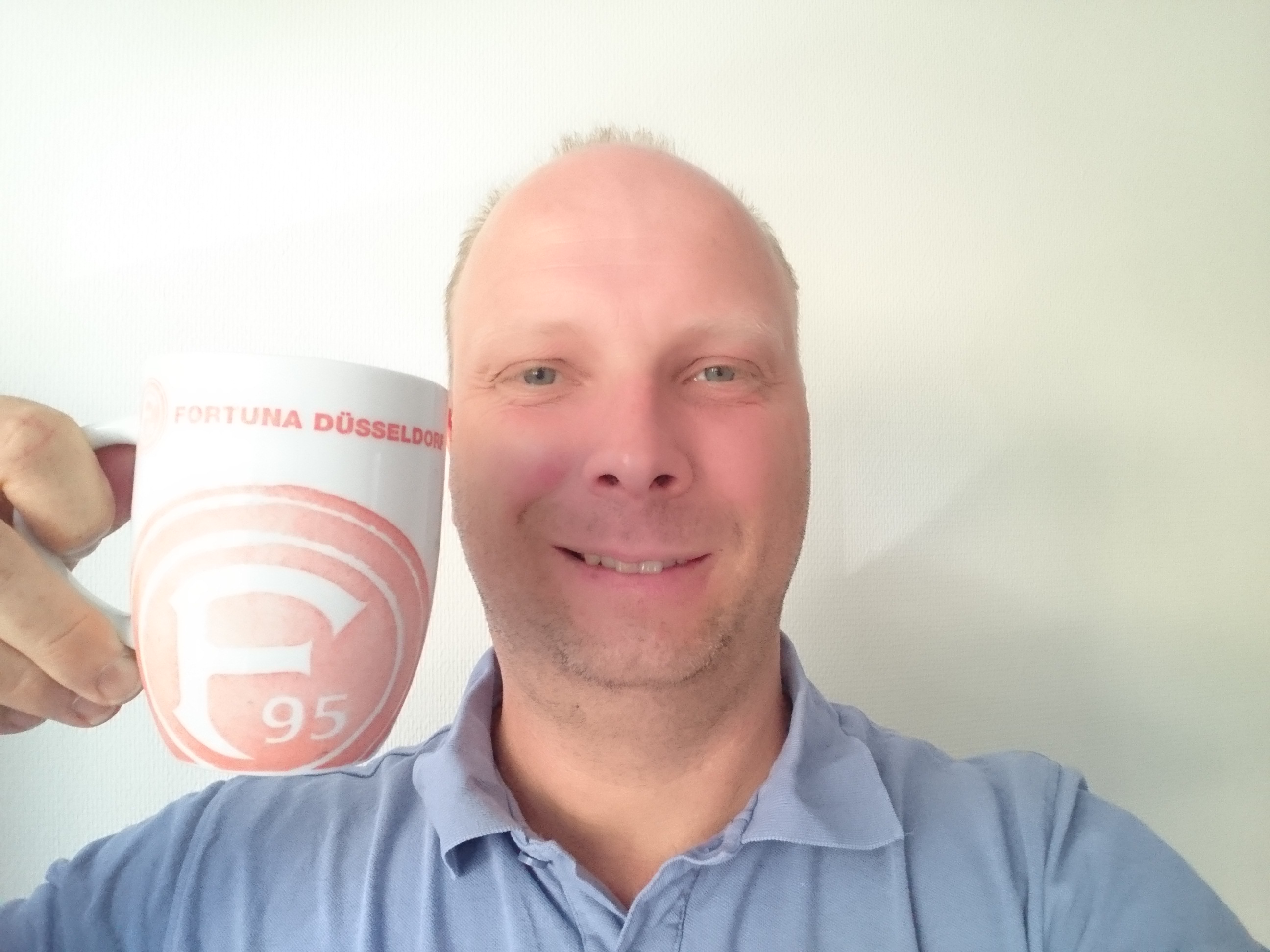 Das LED-Blitzlicht wurde mit etwas Abstand von der Kamera platziert, um überblendungen zu vermeiden. Somit kann das Sony Xperia Z3 unsere allseits beliebte Fortuna-Düsseldorf-Tasse problemlos hell erleuchten: