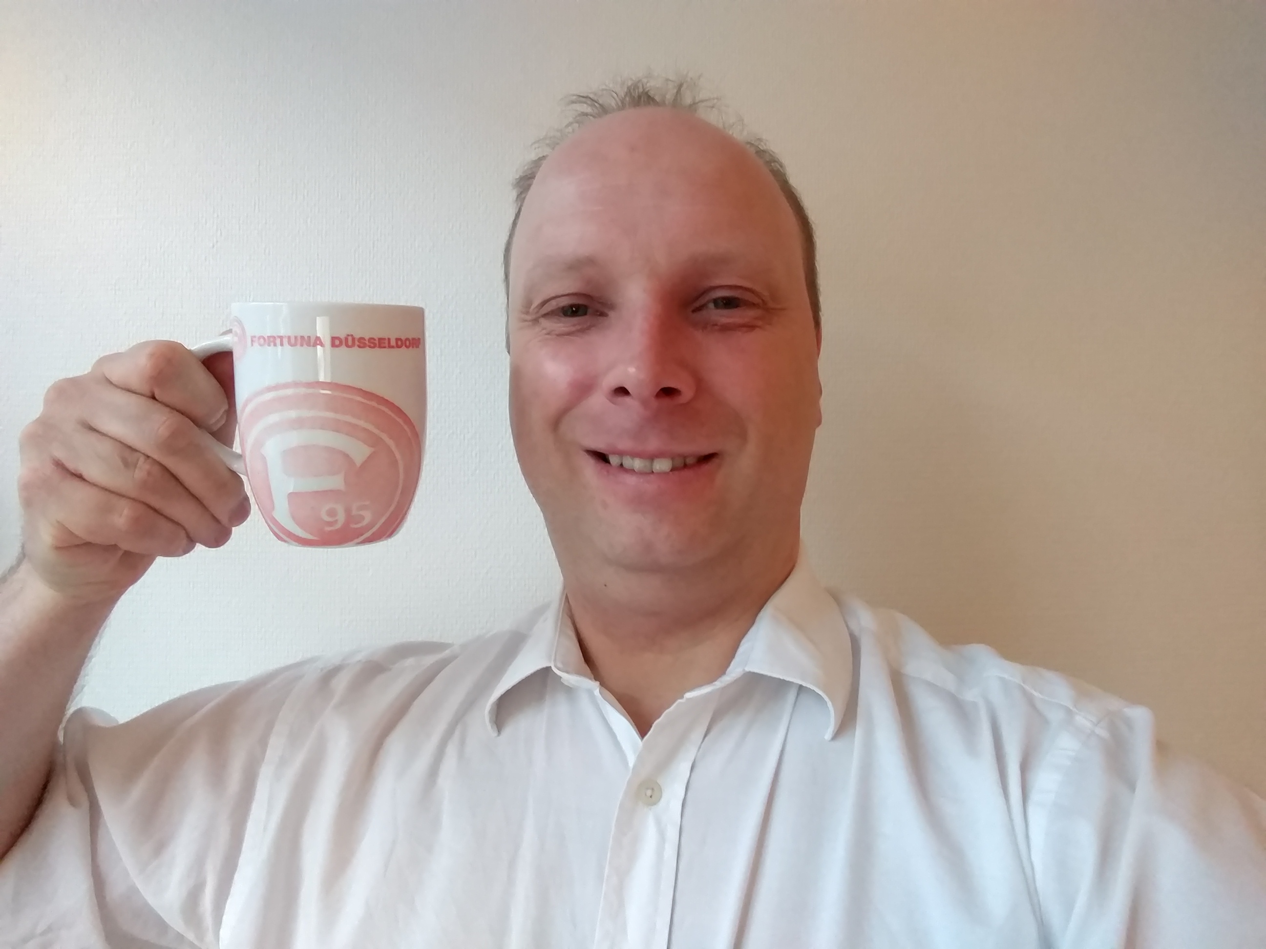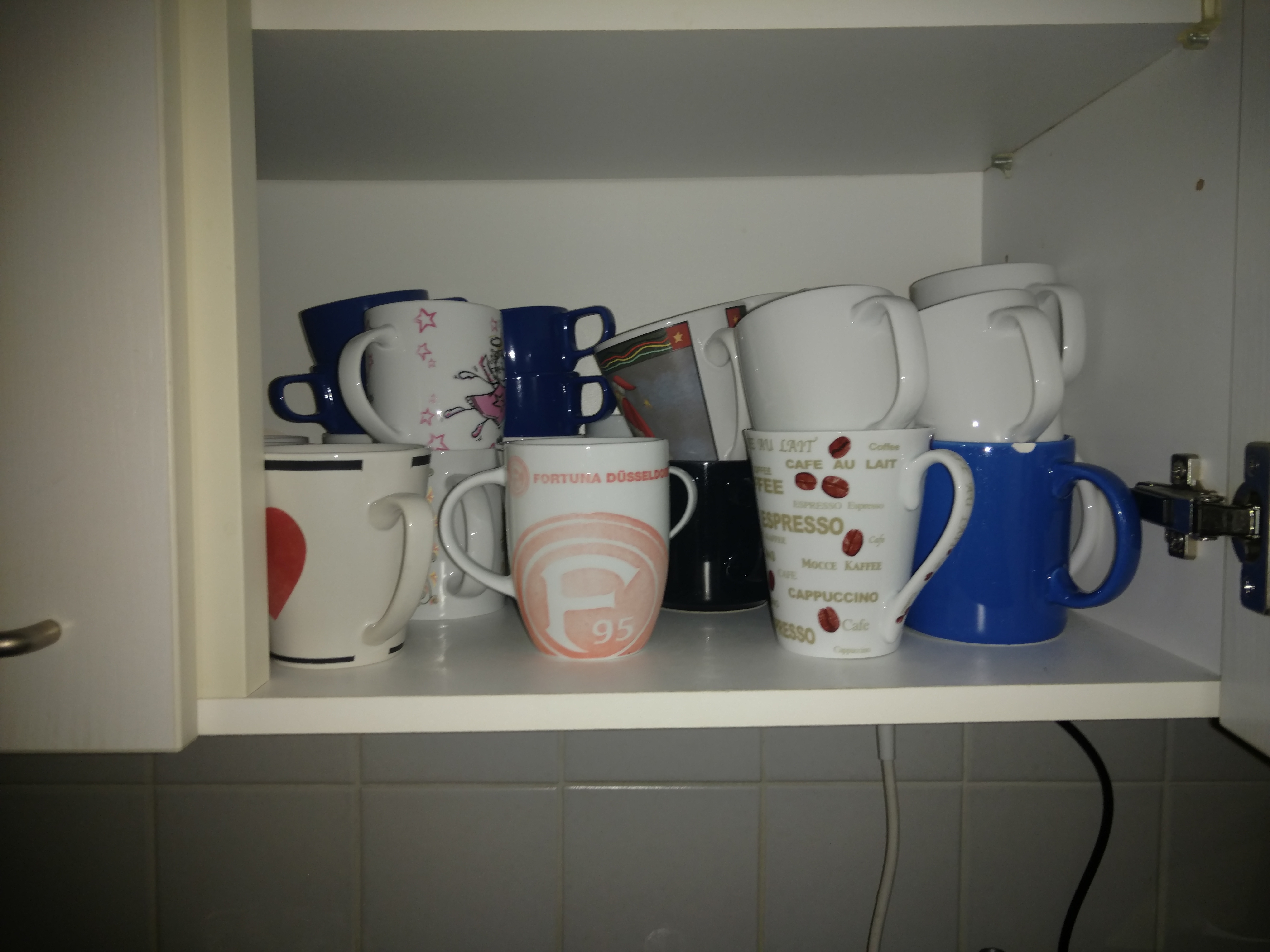 Der Dual-LED-Blitz leuchtet unsere allseits beliebte Fortuna-Düsseldorf-Tasse auch in der komplett dunklen Küche gut aus: