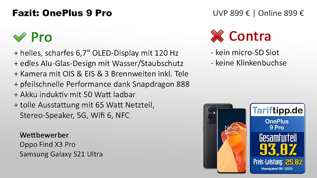 Das OnePlus 9 Pro bekommt von uns die Gesamtnote 93,8%. Damit landet es auf Platz 4 unserer Handy-Bestenliste und liegt nur ganz knapp hinter dem führenden Smartphone, dem Samsung Galaxy S21 Ultra, welches allerdings auch deutlich teurer ist. In Sachen Preis/Leistung ist das OnePlus 9 Pro derzeit ganz klar der beste Deal in der Klasse der High-End Smartphones. Allerdings ist der Vorgänger, das OnePlus 8 Pro nur unwesentlich schlechter: Das OnePlus 9 Pro ist etwas kleiner, etwas schneller und der Akku lässt sich etwas schneller laden. Wer auf dieses "etwas besser" verzichten kann, ist mit dem Vorgänger immer noch sehr gut bedient, zumal es etwa 100 Euro günstiger ist.