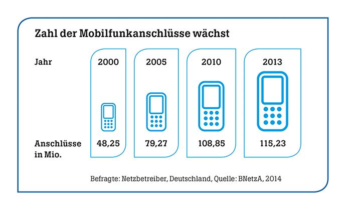 Dass es in Deutschland immer noch mehr Handys als Smartphones gibt, ist auch der zunehmenden Zahl der Mobilfunkanschlüsse insgesamt geschuldet.