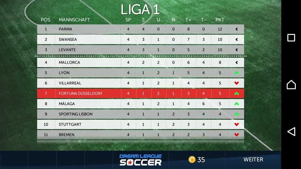 Bei Dream League Soccer startet man in der 3. Liga. Wie wir hier sehen, hat sich unsere virtuelle Fortuna in die 1. Liga durchgekämpft und hält hier einen Mittelfeldplatz.
