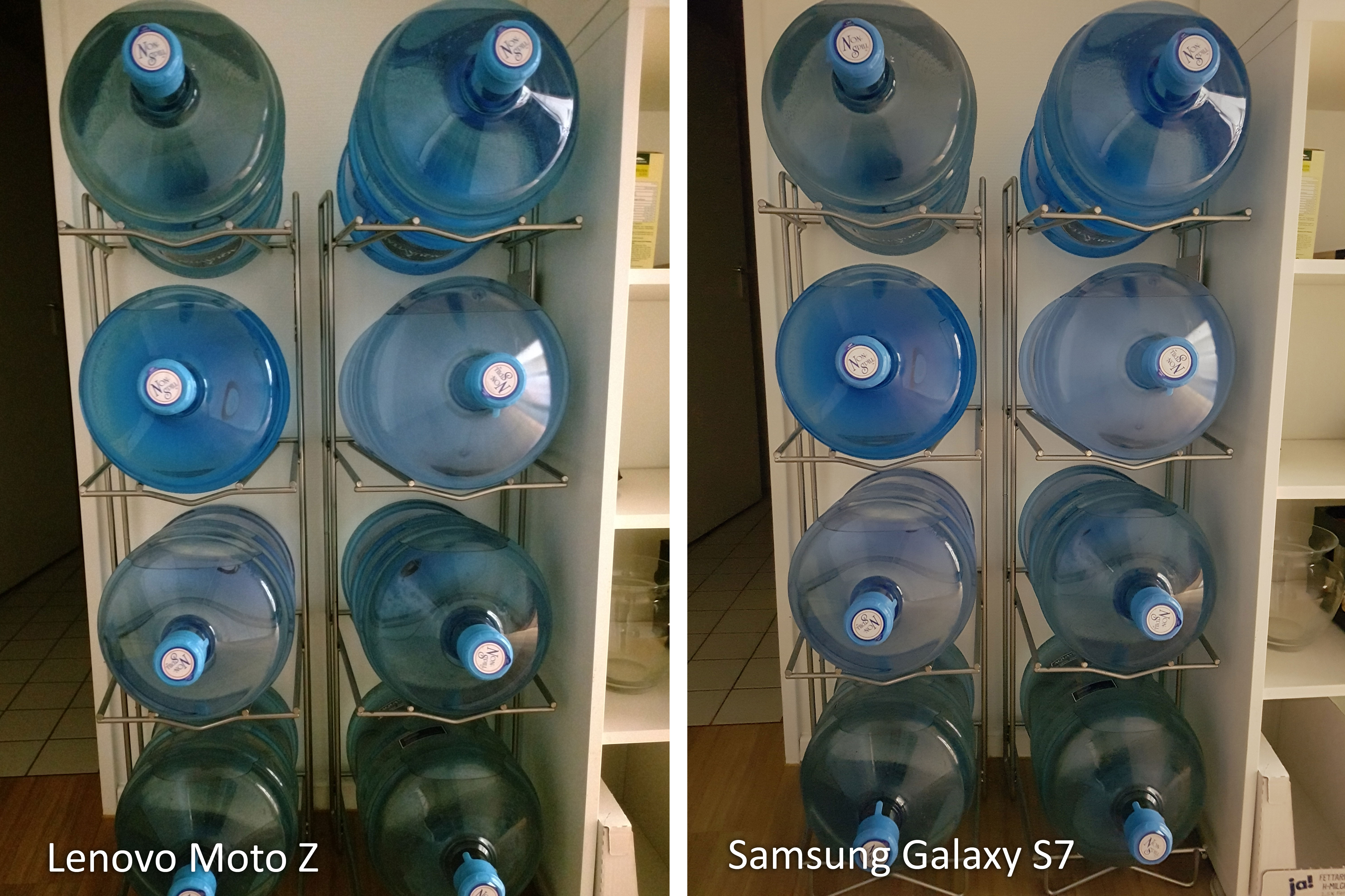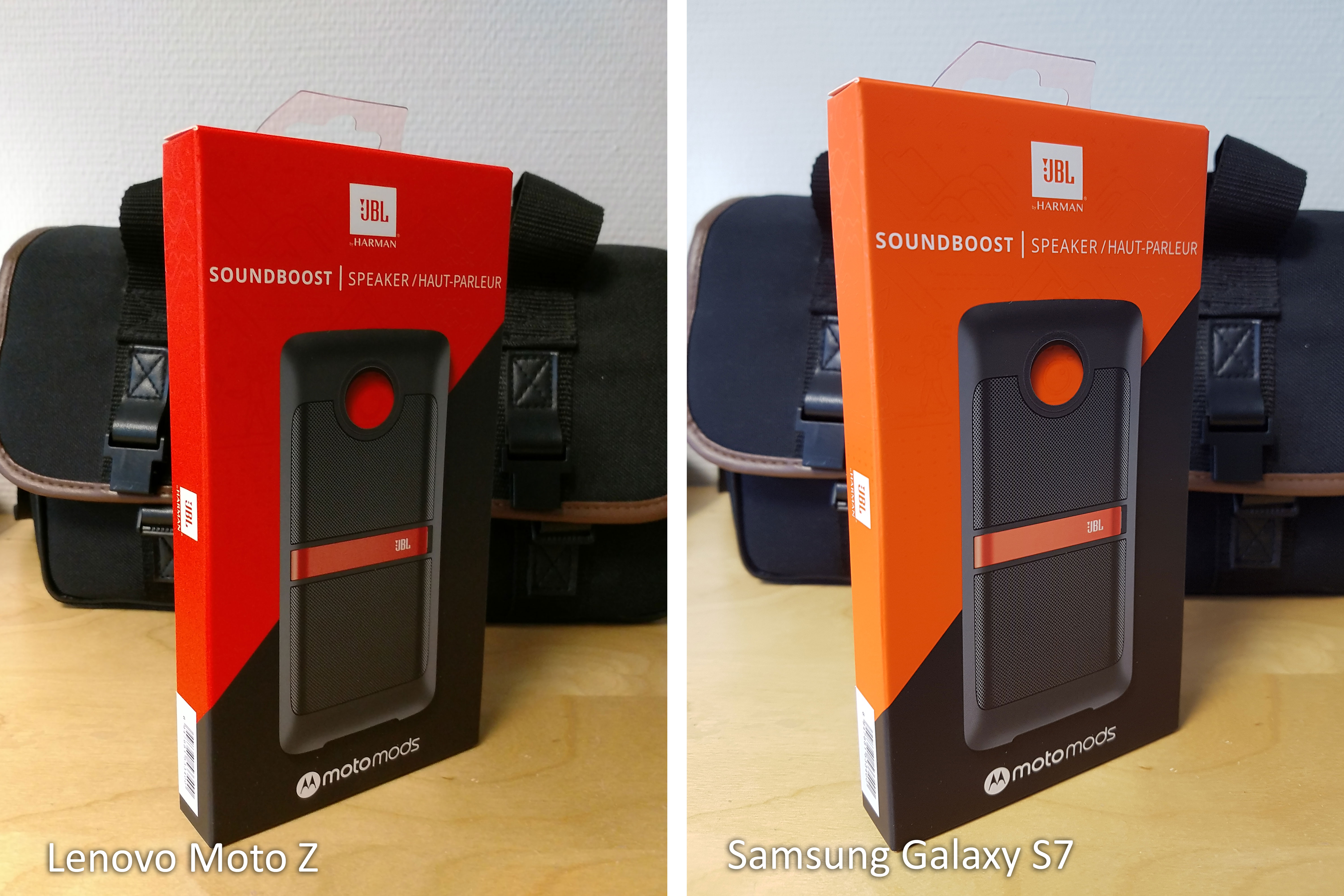 Unterschiede gibt es lediglich bei der Farbtemperatur - mal neigt das S7 zu Gelbstich (Bild 3), mal neigt das Moto Z zum Gelbstich (Bild 6). Bei Bild 6 hat das Moto Z es etwas zu gut gemeint und die Box des JBL-Soundmoduls etwas zu rötlich dargestellt.